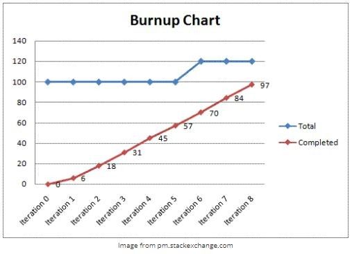 A burn up chart is a graph that shows project progress over time. There are two main lines shown on the chart: one for the total project work planned, and the other for tracking the work completed to date.