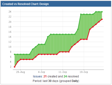 The 'Created vs Resolved' report is a difference chart showing the number of issues created vs number of issues resolved over a given period. The report is based on your choice of issue filter, and selected period of dates.